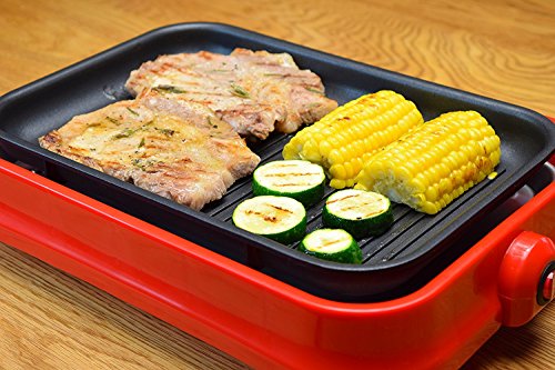 シンプルかつ高性能なホットプレート。取り替えのプレートは平面と網焼きが付いており、網焼きプレートは大部分が網のようになっていて、余分な油を落とすことができます。